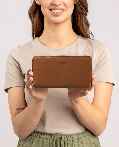 Notre portefeuille pour les femmes fait partie de deux gammes de produits différentes: les modèles de la ligne "Gusti Leder Nature" sont en cuir de chèvre végétal, qui est fait à la main dans de petites entreprises familiales en Inde. Chaque modèle est unique et signifie une production durable et un savoir-faire traditionnel.