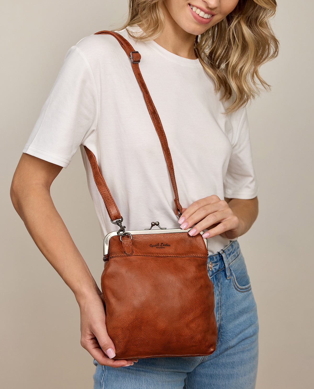 Son intérieur bien pensé comprend un grand compartiment principal et une fermeture métallique au style rétro, garantissant la sécurité de vos affaires. Conçu en cuir de vachette robuste, il allie durabilité et esthétique. Il offre suffisamment de place pour vos carnets, votre téléphone, un rouge à lèvres et votre porte-monnaie, tout en restant compact et facile à porter.