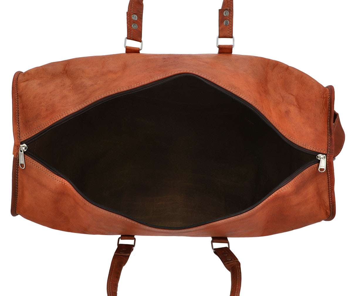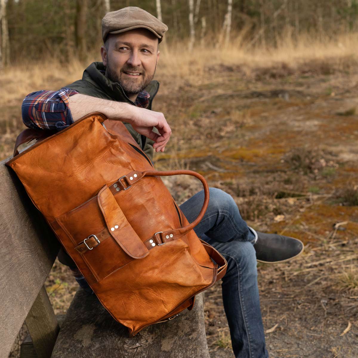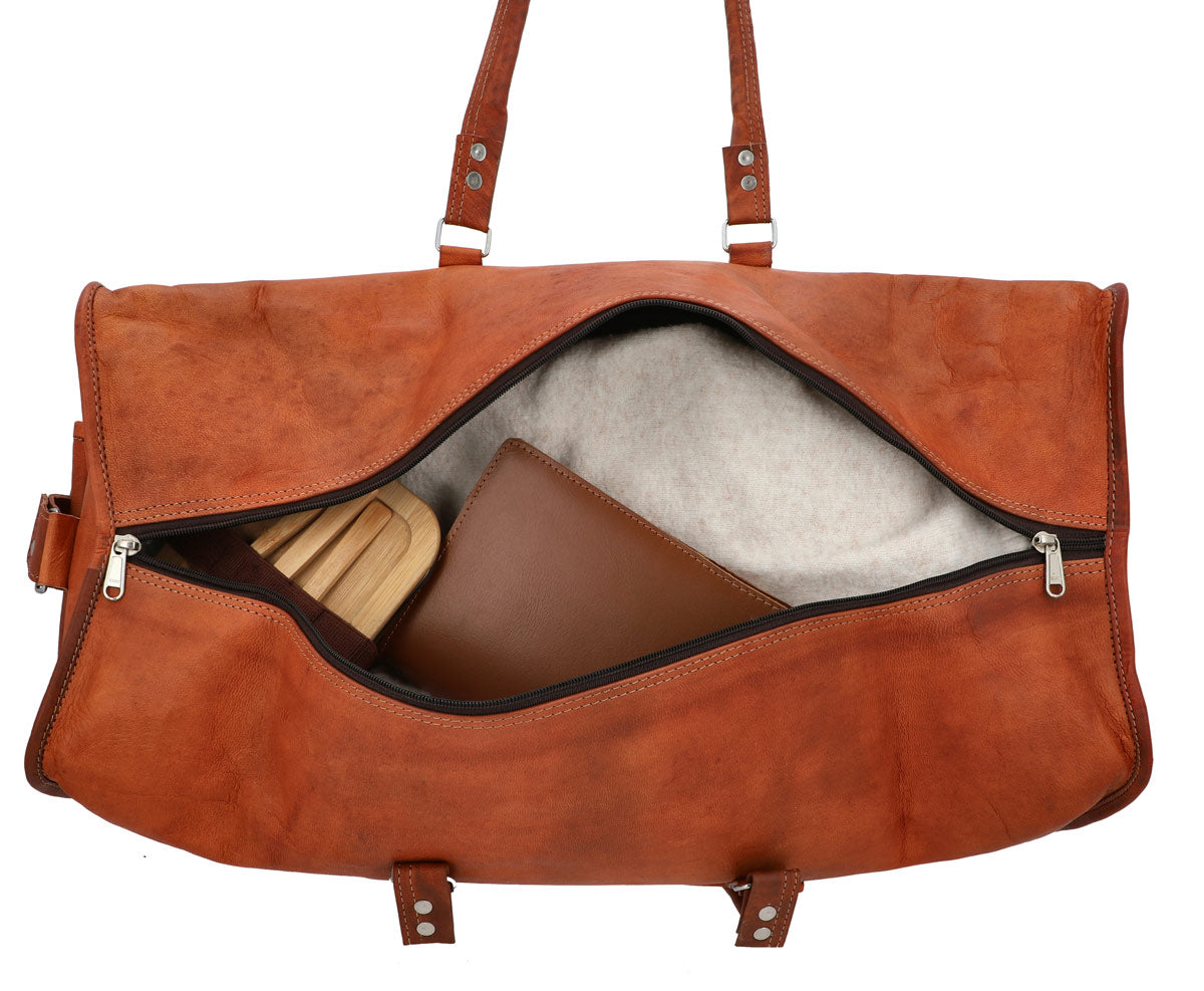 Ce sac de voyage spacieux en cuir de chèvre au tannage végétal ne séduit pas seulement par son design vintage classique, mais aussi par son confort de transport et son espace illimité. Le compartiment principal du sac peut contenir vos vêtements et deux paires de chaussures ainsi que votre trousse de toilette, votre livre préféré ou encore votre ordinateur portable ou quelques dossiers. Une poche intérieure supplémentaire zippée vous permet de ranger en toute sécurité vos affaires les plus précieuses, comme vos documents de voyage, votre porte-monnaie, votre smartphone, etc. Sur le devant, vous trouverez également une grande poche extérieure et sur les côtés, une petite poche dans laquelle vous pourrez ranger des bonbons, des provisions, une Gameboy, des mouchoirs en papier, une petite pharmacie d'urgence, etc. Les boucles à ardillon utilisées confèrent à Oscar ce charme vintage particulier qui séduit immédiatement. Le grand compartiment principal du sac se ferme avec une fermeture éclair pour que rien ne se perde en route.