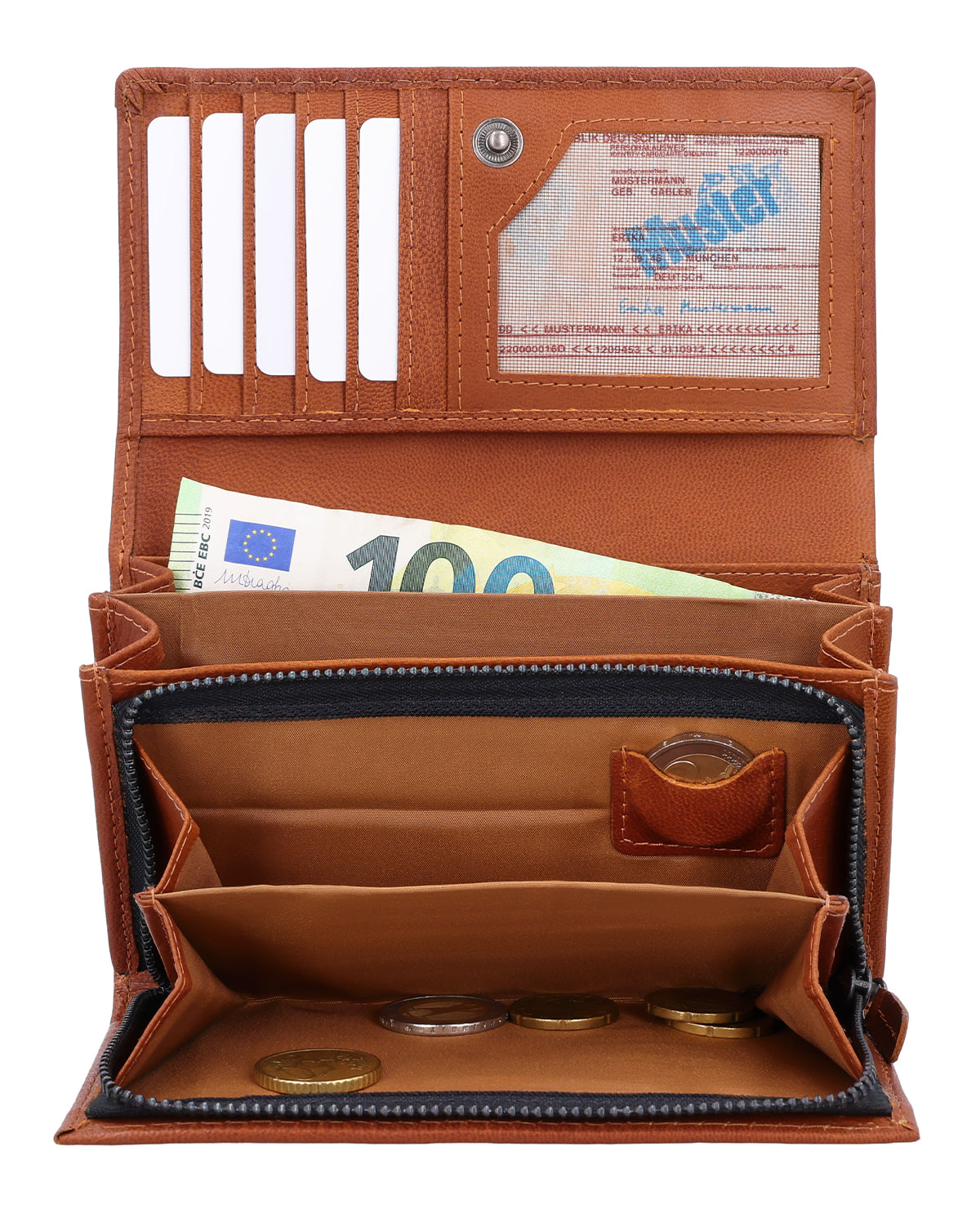 Mit unserem Portemonnaie "Gemma" hast du alles dabei: Karten, Scheine, Kleingeld und Fahrkarten finden ihren angestammten Platz. Die beiden Kleingeldfächer kannst du mit einem Reißverschluss verschließen. Zusätzlich gibt es ein extra Münzfach für eine einzelne Münze – ideal, wenn du mal schnell eine passende Münze griffbereit haben möchtest. In "Gemma" findest du Platz für mindestenst fünf Karten, außerdem bieten wir dir noch einen Kartensteckplatz mit transparentem Sichtfenster für deinen z.B. deinen Ausweis. Deine Geldscheine sind in zwei separaten Fächern gut untergebracht. Dank integriertem RFID-Schutz sind deine Karten zudem zuverlässig vor ungewolltem Auslesen geschützt. Das restliche Portemonnaie wird durch einen Druckknopf zusammengehalten. So kommst du schnell an dein Geld, es ist aber trotzdem vor dem Hinausfallen geschützt. Die Geldbörse besteht aus robustem Rindsleder und ist so ein wahrer Alltagsheld: perfekt für Vieleinkäufer und die, die es noch werden wollen!