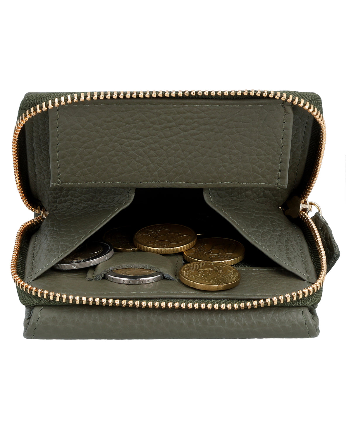 Im Inneren verfügt „Brigitta" über ein Geldscheinfach, ein ausklappbares Sichtfenster, Platz für bis zu 6 Karten und ein separates Münzfach, welches per Reißverschluss abgeschlossen wird. Im Münzfach findest Du außerdem einen extra Steckplatz für eine 1-€-Münze, ideal für Einkaufswagen oder Schließfächer. So purzelt nichts ungehindert in die Tasche. Aus hochwertig verarbeitetem Rindsleder wird das Portemonnaie mithilfe eines Druckknopfs verschlossen. Ab in die Tasche – es kann losgehen mit Brieftasche „Brigitta"!