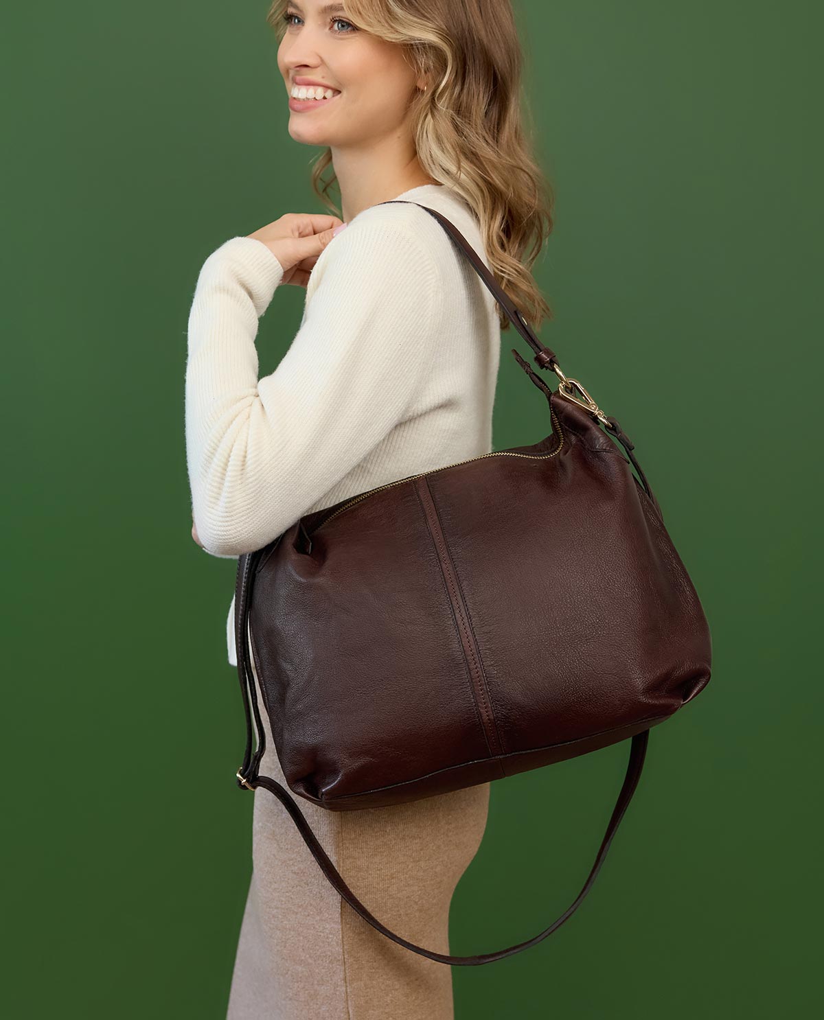 Du suchst einen klassischen Shopper, der Dich nie im Regen stehen lässt? Dann ist "Hannah" genau die Richtige für Dich. Diese mittelgroße Umhängetasche aus robustem und widerstandsfähigem Rindsleder in sanftem Dunkelbraun liegt voll im Trend. Mit ihrem geräumigen Innenfach bietet sie ausreichend Platz für alles, was Du bei einem Stadtbummel oder im Berufsalltag brauchst. Inspiriert durch den lebendigen Berliner Großstadt Flair verbindet "Hannah" urbanen Stil mit praktischer Funktionalität.