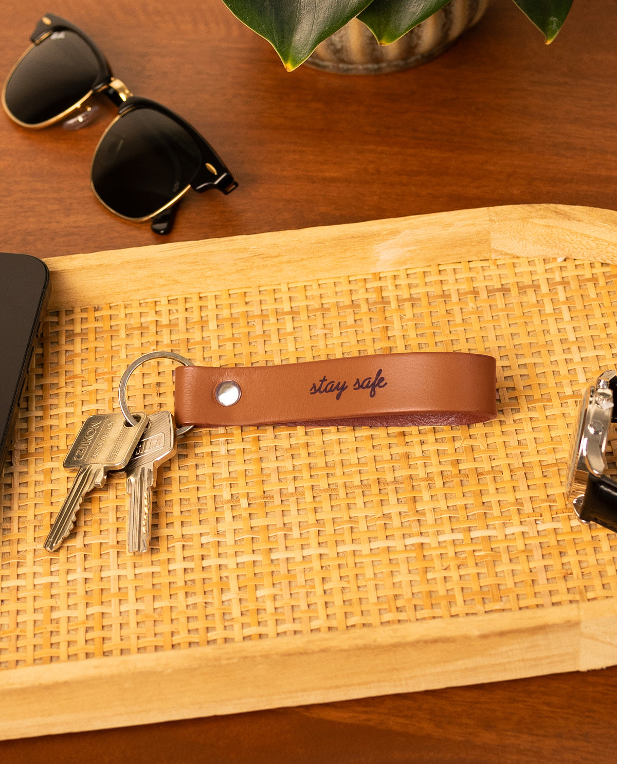 Unser schickes Schlüsselband kommt in vielen verschiedenen Farben - bestimmt ist auch deine Lieblingsfareb dabei. An dem Schlüsselring kannst du beliebig viele Schlüssel und Karabiner befestigen. Durch eine individuelle Gravur bekommt dein Freund oder deine Freundin nicht nur ein praktisches Geschenk, sondern auch ein ganz persönliches. Verewige das gemeinsame Motto oder hinterlasse eine schöne Nachricht auf dem ledernden Schlüsselbund "Shelton".