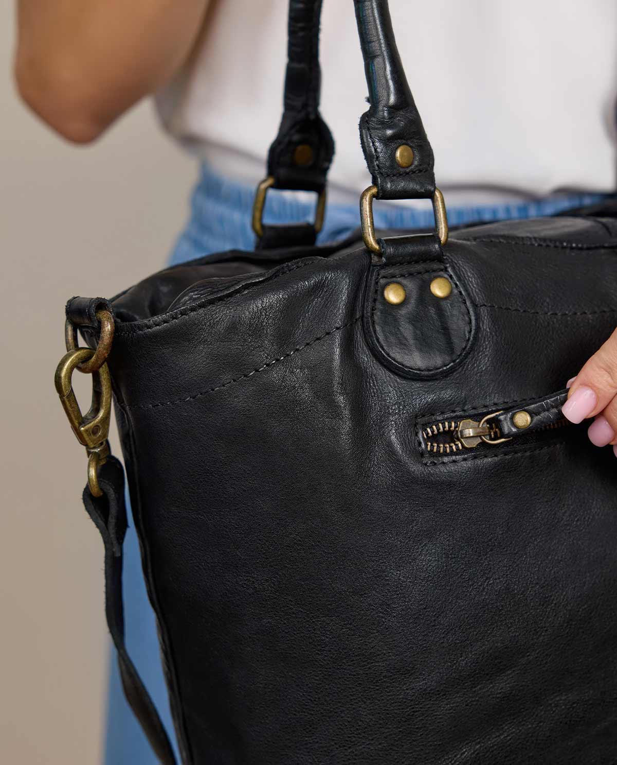 Mit ihren großzügigen Abmessungen bietet die schwarze Ledertasche ausreichend Platz für all deine Essentials. Egal, ob du sie als Handtasche, Umhängetasche oder Shopper verwendest, du wirst von der Funktionalität begeistert sein. Im Inneren der Tasche findest du mehrere Fächer und ein separates Laptopfach, um deine persönlichen Gegenstände organisiert zu halten.