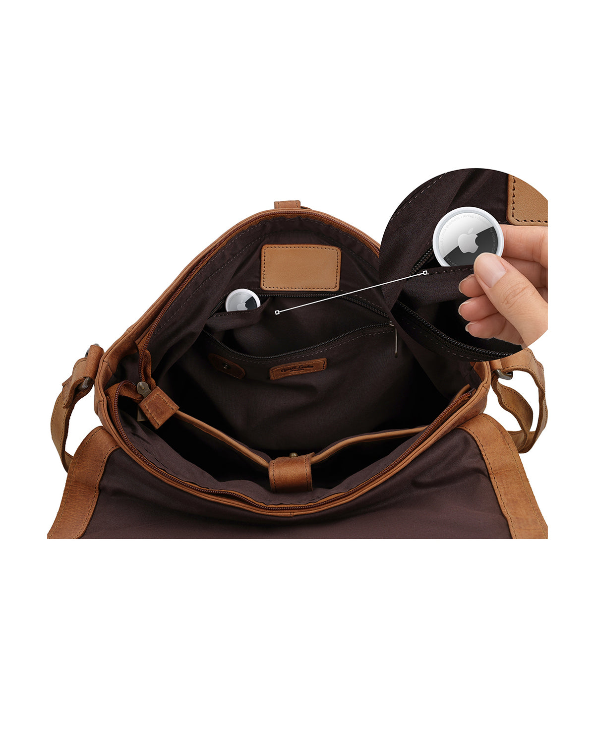 Die Businesstasche „Brin“ ist eine braune Ledertasche für Damen und Herren, die Struktur in Deinen Tag bringt, ohne dabei steif zu wirken. Sie begleitet Dich ins Büro, zu Terminen oder auf Reisen und verbindet eine klare, professionelle Ausstrahlung mit durchdachten Funktionen. Für ein gutes Gefühl unterwegs ist ein verstecktes AirTag-Fach integriert, während ein abnehmbarer Schlüsselanhänger dafür sorgt, dass Du wichtige Dinge nicht lange suchen musst. Im Inneren schützt ein Laptopfach Dein Gerät zuverlässig, ergänzt durch ein Steckfach mit Druckknopfverschluss und ein Reißverschlussfach, damit Unterlagen, Kabel oder kleinere Essentials ordentlich verstaut bleiben. Der Hauptverschluss mit Reißverschluss, ergänzt durch Magnete, verbindet Sicherheit mit einer unkomplizierten Handhabung im Alltag.