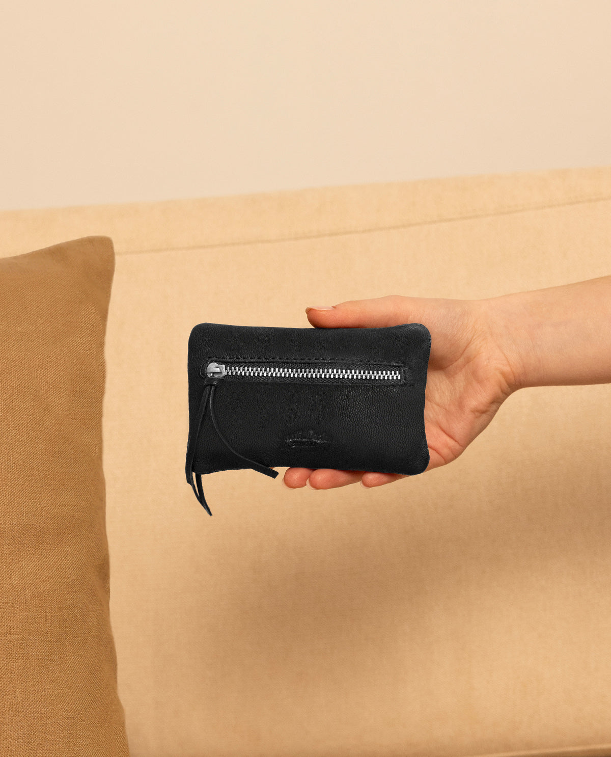 Das schwarze Lederportemonnaie besticht durch sein elegantes und kompaktes Design. Der Hauptverschluss befindet sich in der Mitte und ermöglicht Dir einen schnellen Zugriff auf Deine Karten und Dein Bargeld. Auf der Rückseite befindet sich ein zusätzlicher Verschluss, der für zusätzliche Sicherheit sorgt. Diese Brieftasche ist perfekt für den täglichen Gebrauch, denn sie ist nicht nur praktisch, sondern auch stylisch.