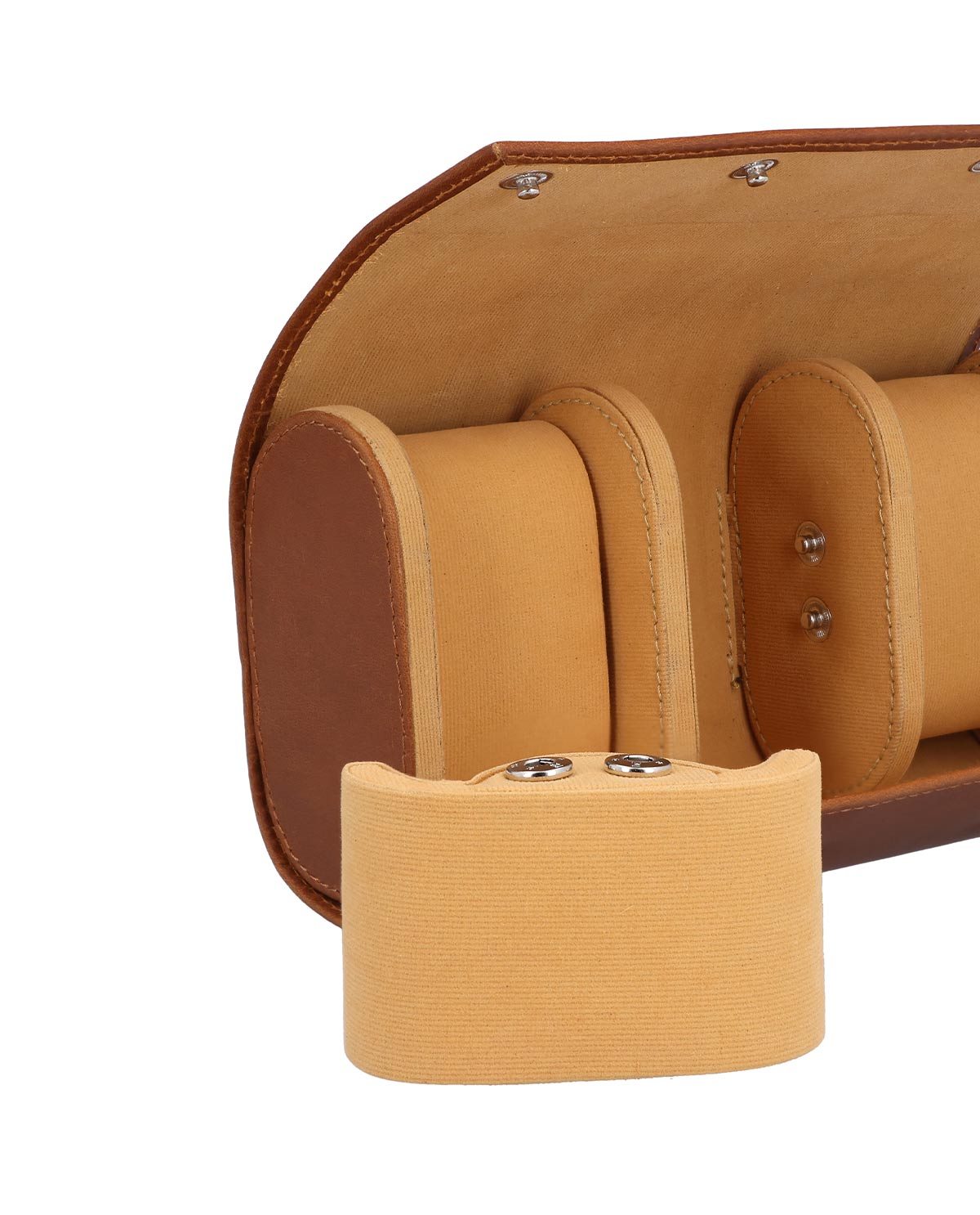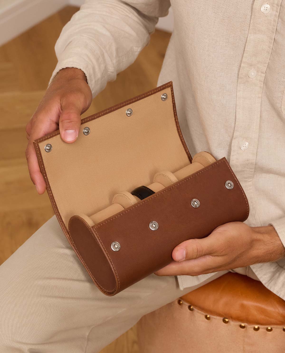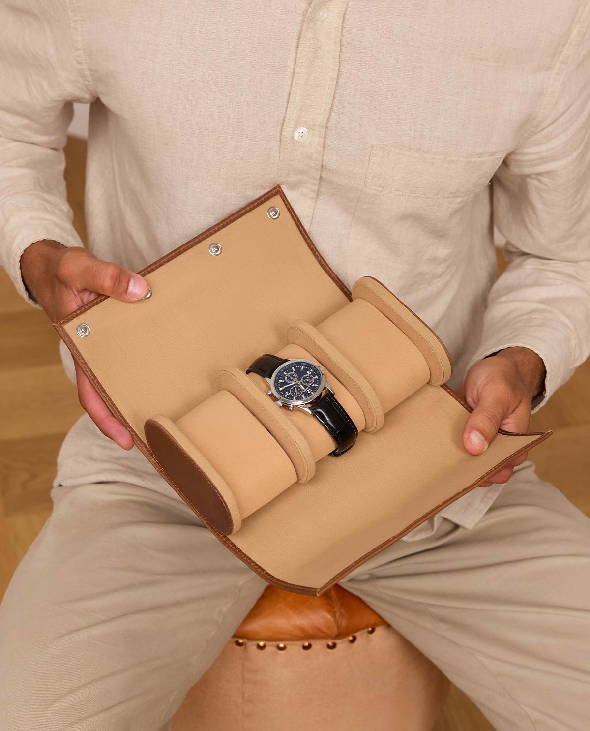 "Neven" bietet Platz für drei Uhren, die jeweils auf einem separat gepolsterten Kissen liegen. So bleiben Deine Zeitmesser fest an ihrem Platz, selbst während der Reise. Die Druckknöpfe sorgen für ein sicheres Verschließen, während sie gleichzeitig einen schnellen Zugriff ermöglichen. Das kompakte Format und die hochwertige Haptik machen "Neven" zum idealen Begleiter für Uhrensammler, Vielreisende oder Liebhaber stilvoller Aufbewahrung. Eine perfekte Kombination aus Schutz, Stil und Qualität – für Deine schönsten Uhren.