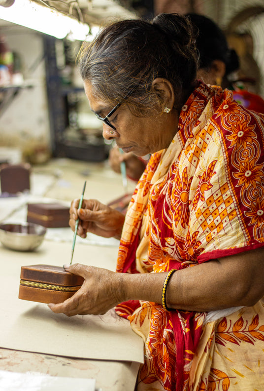 Cette responsabilité commence bien avant qu'un produit n'arrive entre vos mains. Gusti Leder renonce systématiquement aux intermédiaires et collabore directement et en partenariat avec des producteurs en Inde, que nous visitons régulièrement en personne. Ce qui est particulièrement important pour nous, c'est le traitement respectueux de tous les employés : des salaires équitables, des conditions de travail sûres et l'assurance claire que le travail des enfants est exclu. Nous ne considérons pas la responsabilité comme un supplément, mais comme une partie intégrante de notre philosophie. C'est pourquoi la transparence n'est pas pour nous un mot vide, mais une pratique quotidienne : nous sommes ouverts sur l'origine de notre cuir, sur la façon dont il est traité et sur les valeurs qui sous-tendent nos décisions.