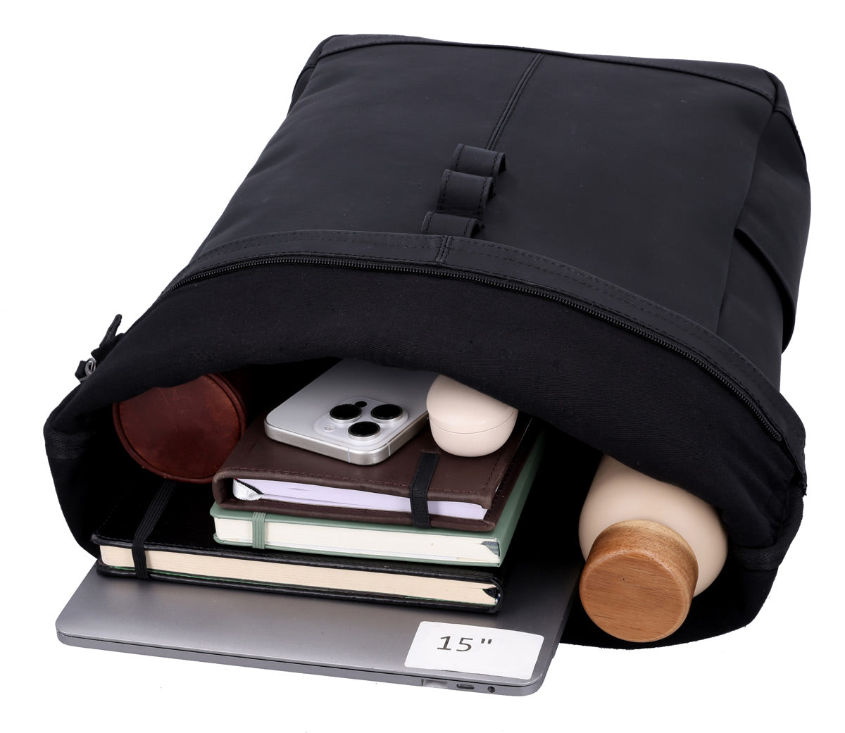 Le sac à dos séduit non seulement par son look, mais aussi par l'espace de rangement qu'il offre. Dans le compartiment intérieur vraiment spacieux avec les poches supplémentaires, un classeur A4 ou un ordinateur portable de 15" trouvent facilement leur place – il y a même un compartiment séparé pour ordinateur portable. Une poignée de livres et une grande bouteille d'eau peuvent également être rangées sans problème. Le mécanisme de fermeture du compartiment principal est aussi simple que pratique et protège vos effets personnels de l'humidité et de la poussière. L'intérieur du sac à dos est doublé de polycoton déperlant, tandis que la partie arrière rembourrée et le dessous des bretelles réglables en longueur sont dotés de toile assortie – pour un confort de port supplémentaire.