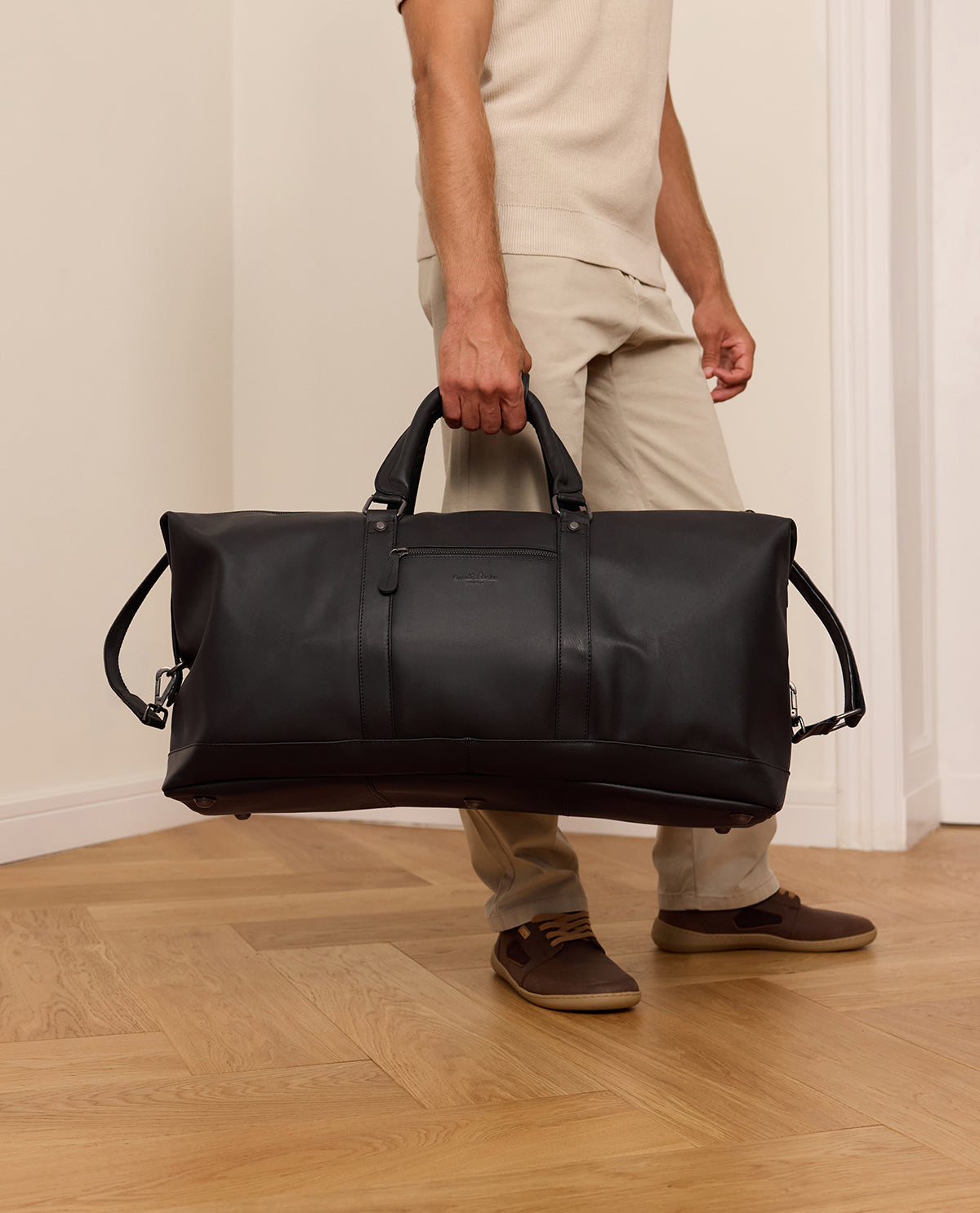 En effet, ce sac de voyage en cuir très spacieux ne se distingue pas seulement par son design intemporel et classique, mais aussi par son confort de port et son espace incroyable. Ainsi, tu peux y ranger non seulement des vêtements de rechange et des chaussures, mais aussi ton livre préféré, ta trousse de toilette ou même ton ordinateur portable si tu dois travailler le soir. À l'avant, tu trouveras également une poche extérieure à fermeture éclair supplémentaire, dans laquelle tu peux ranger des objets tels que des clés, des mouchoirs, une petite trousse de secours et bien plus encore. Le look usé du cuir donne à "Fernando" le charme d'un sac de voyage vintage, tout en offrant les avantages des sacs de voyage modernes. Et en termes de confort, "Fernando" ne fait pas exception. Grâce à ses deux poignées solides et à une sangle d'épaule amovible, tu peux porter "Fernando" comme tu le souhaites.