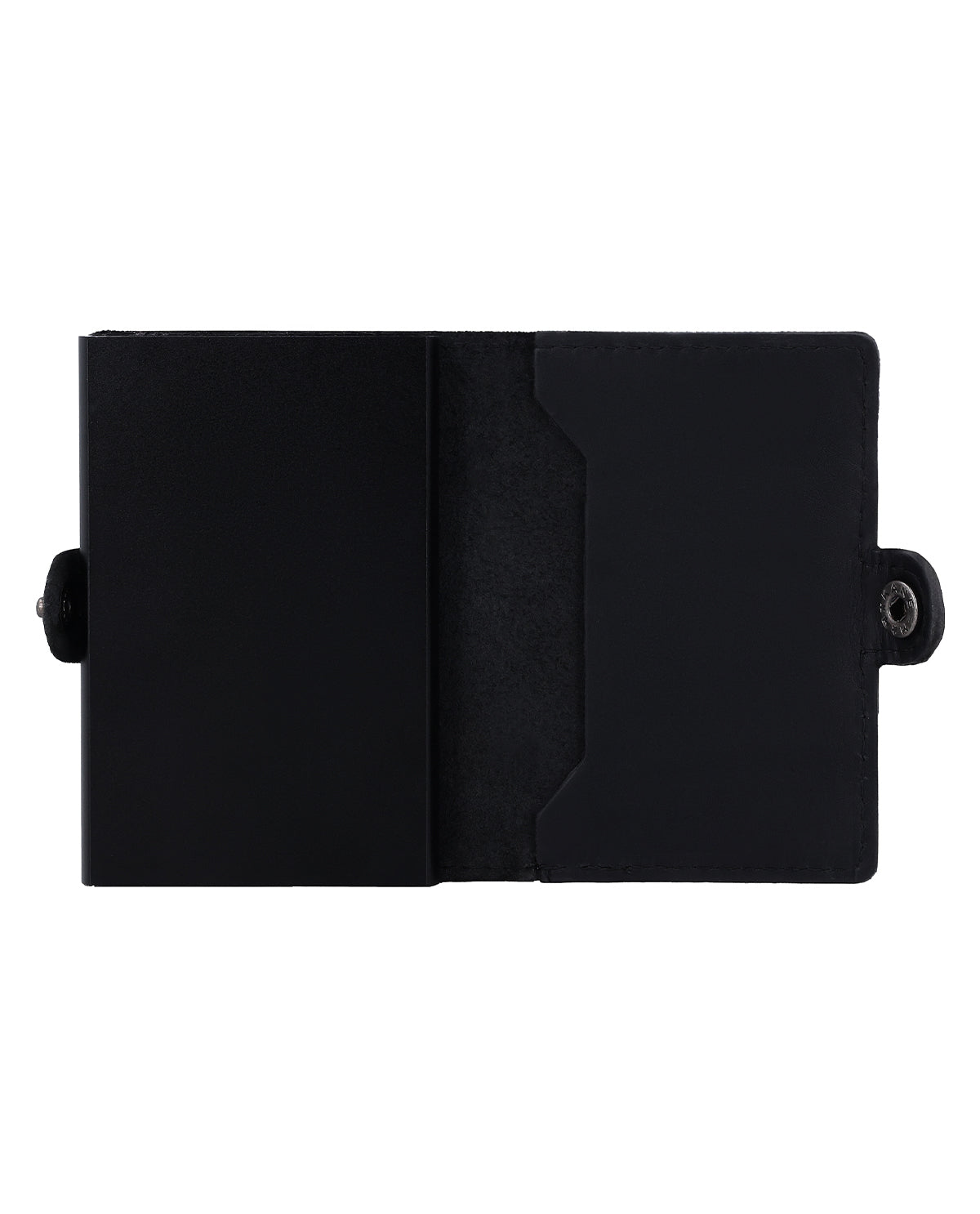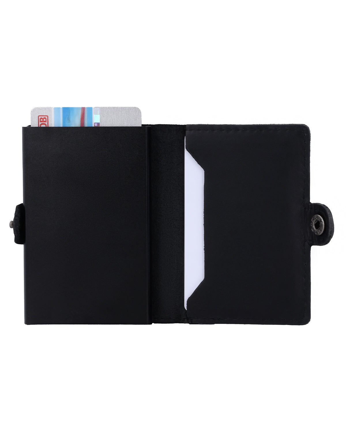 Le portefeuille noir « Murat » est un portefeuille pour hommes qui combine fonctionnalité et design épuré. Le cœur est le mécanisme pop-up automatique, grâce auquel vos cartes glissent vers le haut d'une simple pression sur un bouton. Le boîtier en aluminium intégré protège vos cartes de manière fiable et confère au portefeuille une stabilité moderne. Grâce à la fermeture à pression, tout est bien rangé, tandis que le design sobre reste souverain et réduit.