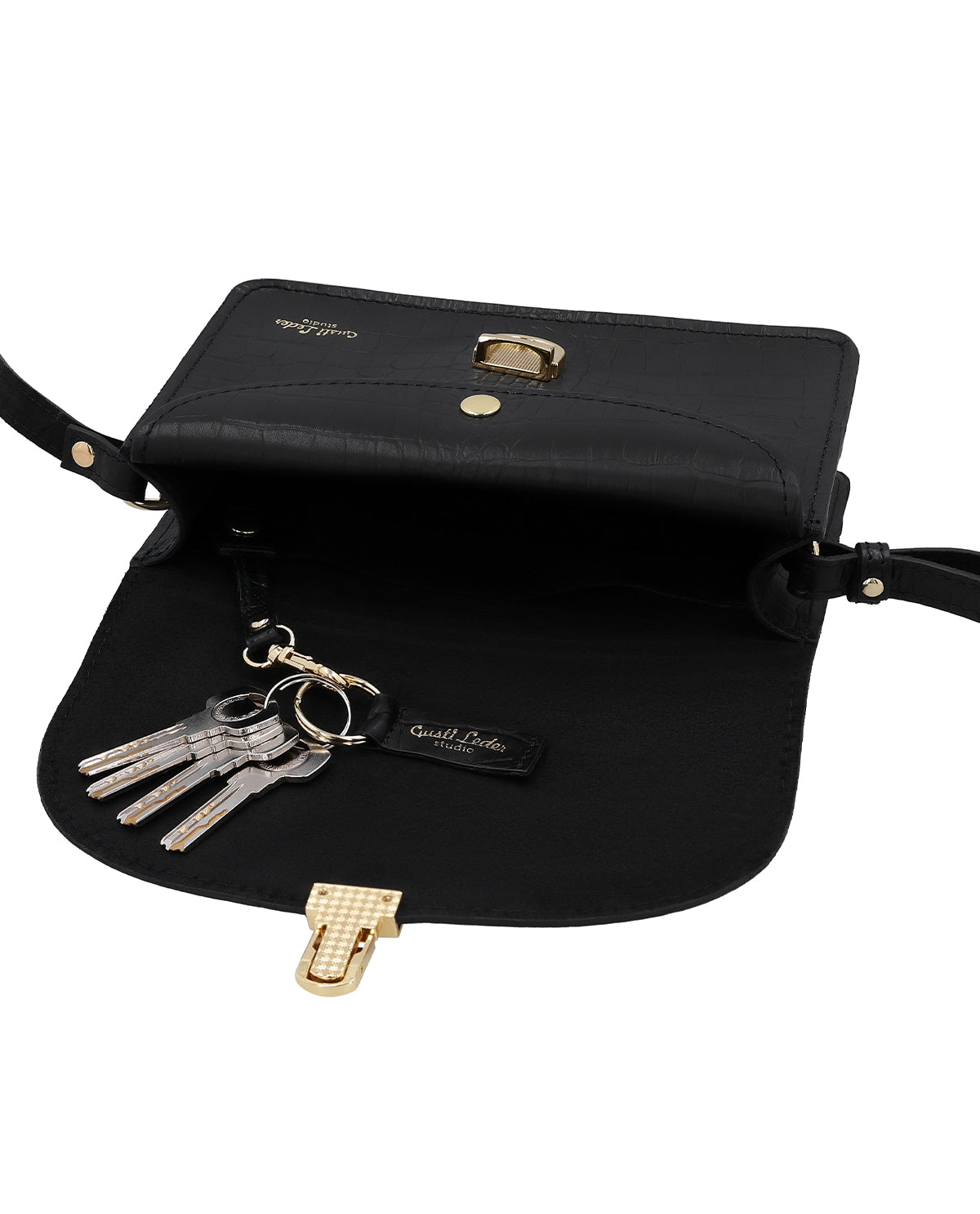 Vous cherchez LE sac bandoulière qui transforme la nuit en jour ? Qui rehausse également n'importe quelle tenue de tous les jours ? "Sandy" vient à la rescousse ! Sa forme étroite en fait un sac bandoulière idéal. La texture croco se démarque discrètement du cuir de vachette noir profond du sac et se distingue par son style grâce à ses appliques dorées discrètes.